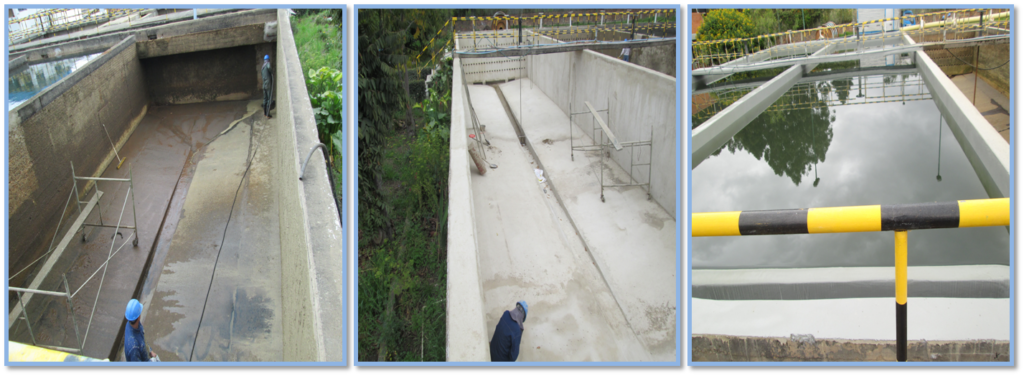 La exposición y el contacto continuo de las estructuras internas de los tanques sedimentadores y canales de vertimiento con el agua, causan el deterioro , desgaste y debilitamiento de la capa superficial del concreto. Fisuras del concreto expuestos a la humedad generan corrosión y debilitan el cuerpo metálico del tanque debido a la no utilización de un impermeabilizante para mitigar estos efectos: por lo anterior fue necesario realizar resanes en las fisuras, para mejorar la resistencia y controlar el deterioro de las estructuras, para luego aplicar la capa de impermeabilizante de poliurea pura, con el fin de garantizar el servicio y función que desempeñan los tanques y canales en el proceso de sedimentación de la planta de tratamiento de agua Surba.